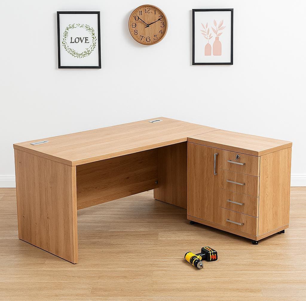 The side return includes an upper lockable drawer and a spacious cabinet door below—perfect for keeping sensitive files, electronics, or office accessories safe and organized.