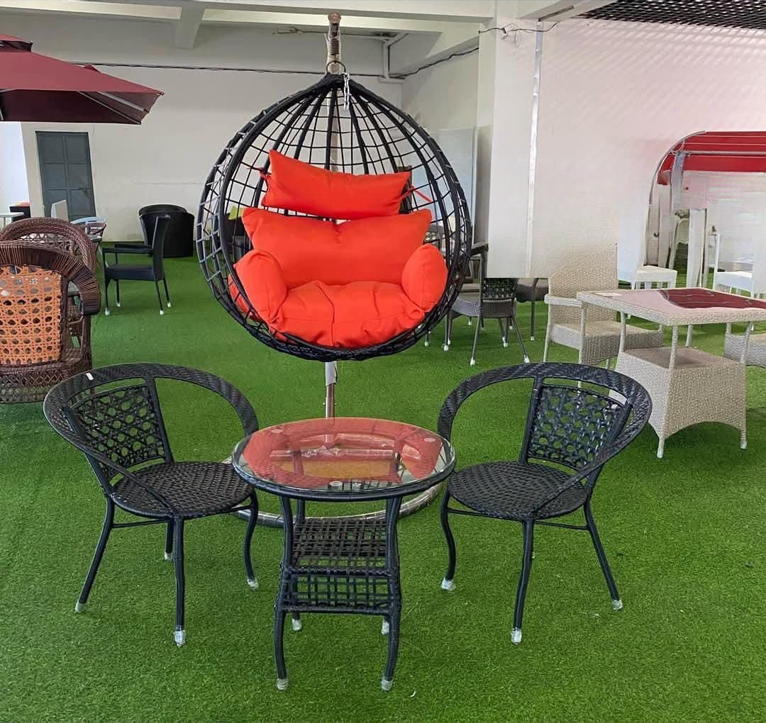 This premium outdoor furniture set features a unique hanging egg chair perfect for relaxing, alongside a chic round glass top table and two elegant rattan chairs.
