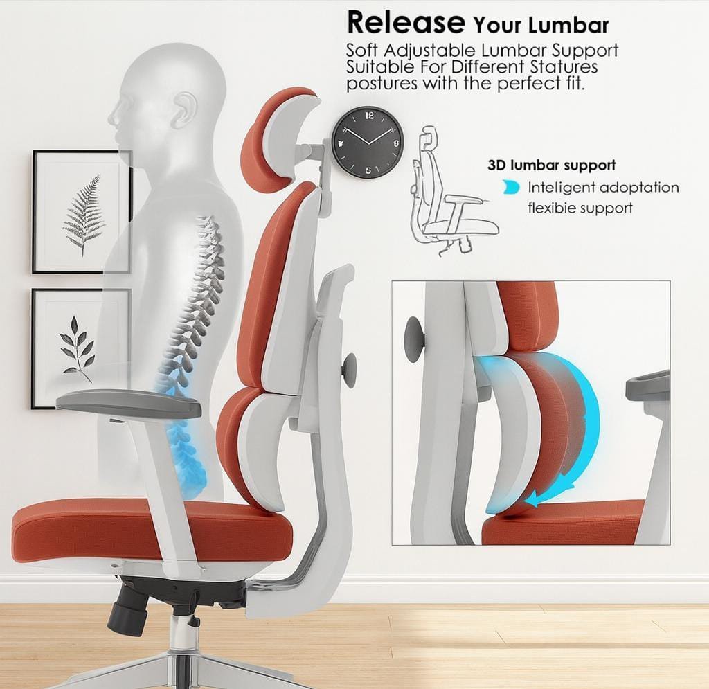 Its flexible back lumbar support adapts to your spine’s natural curve, reducing lower back pressure and enhancing all-day comfort.