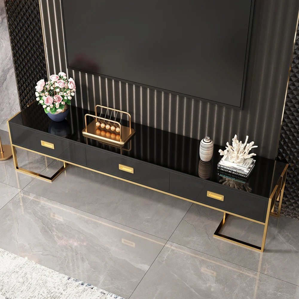 This modern TV console features a sleek design with a combination of golden-plated metal and glossy MDF wood, creating an unforgettably elegant look.