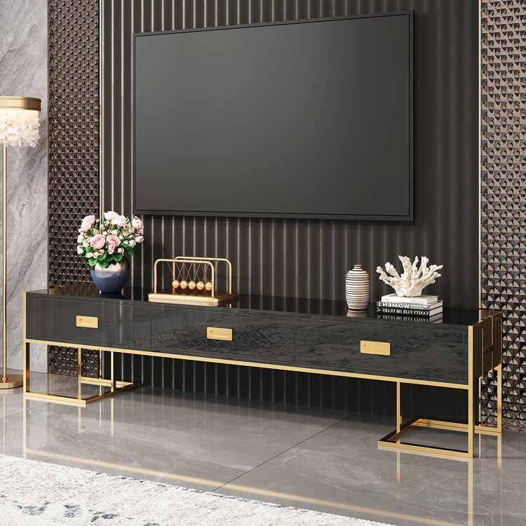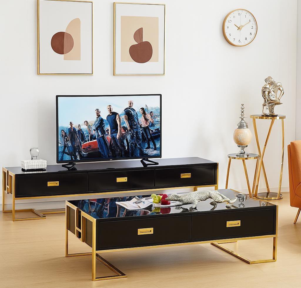Jocise-Matching TV Stand And Coffee Table – TV stand 200x40x45cm (fits 72”), table 120x60x45cm, 3+4 drawers, glossy MDF & gold chrome frame.