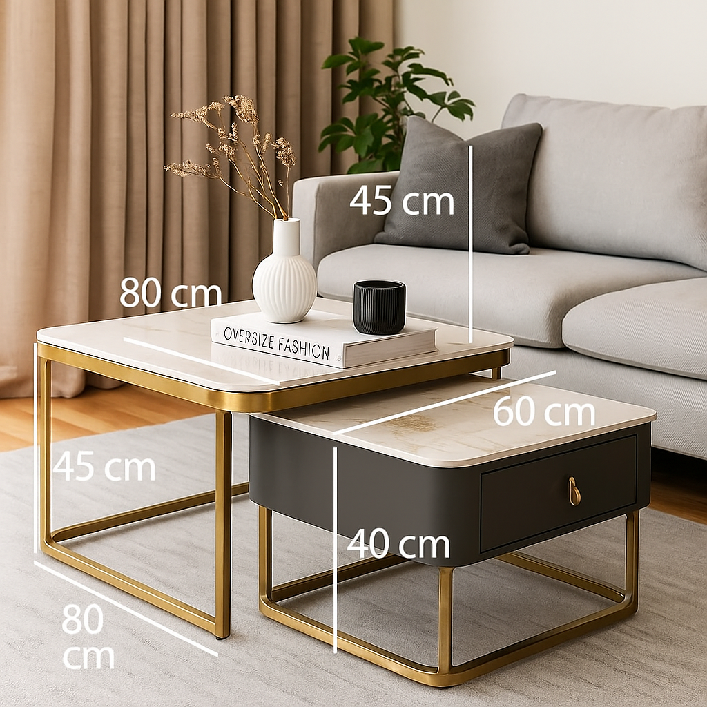 Whether used as a modern coffee table, marble top coffee table, or as a functional twin table set, the Luxestone Twin Table elevates your interior with its timeless appeal. The larger table measures L80 × W80 × H45cm, while the smaller companion table measures L60 × W60 × H40cm, giving you versatile display and storage options for your home or office space.