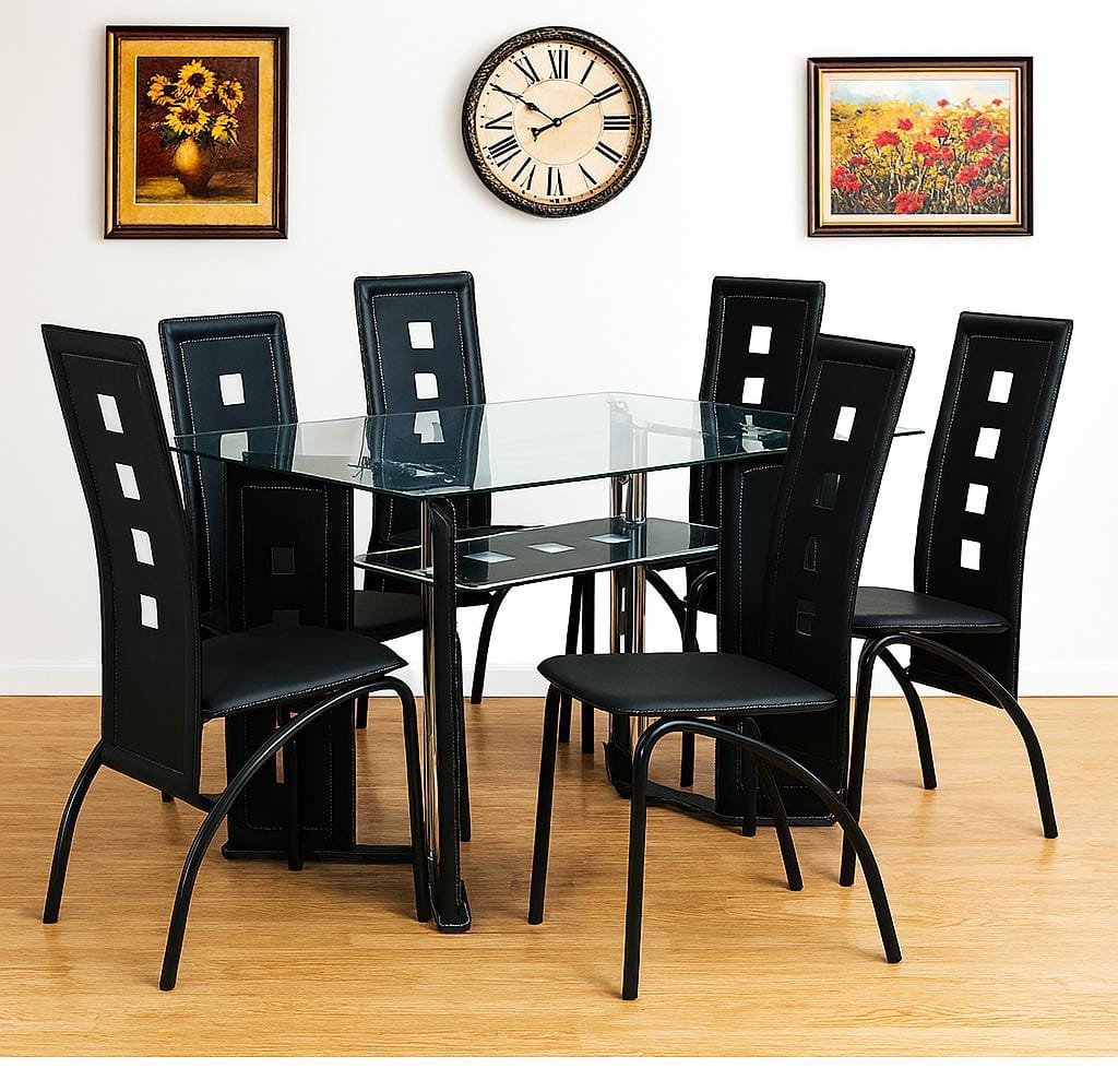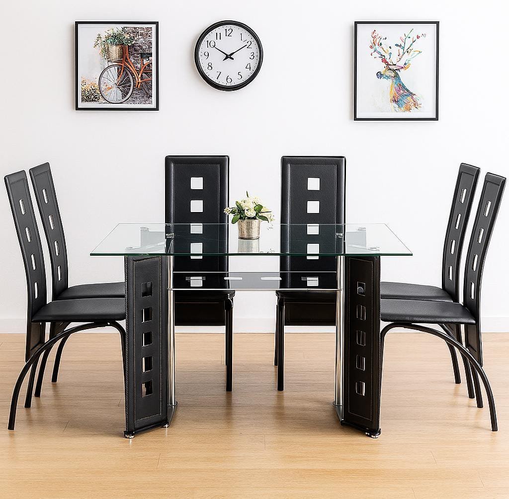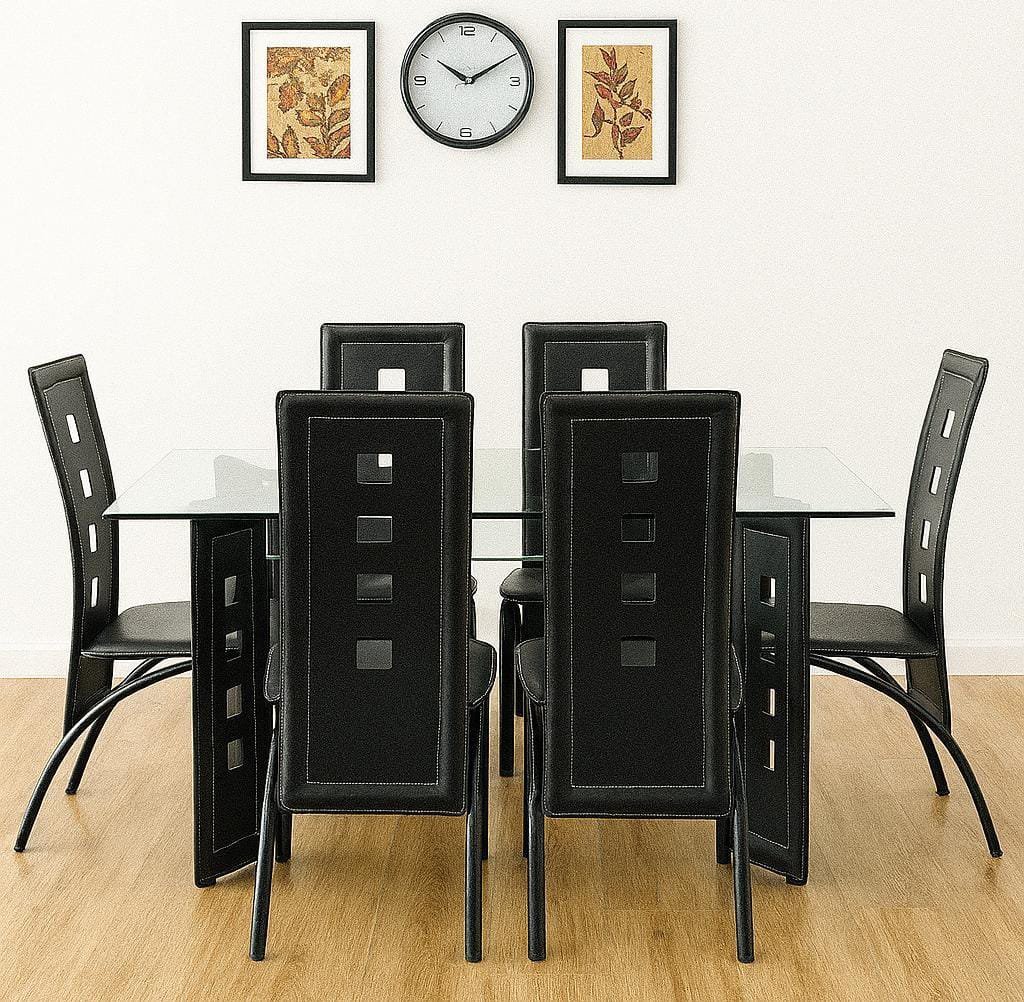 This 7-piece set is built for both aesthetics and practicality, offering a tempered glass dining table and six matching metal and leatherette dining chairs.