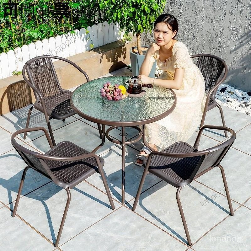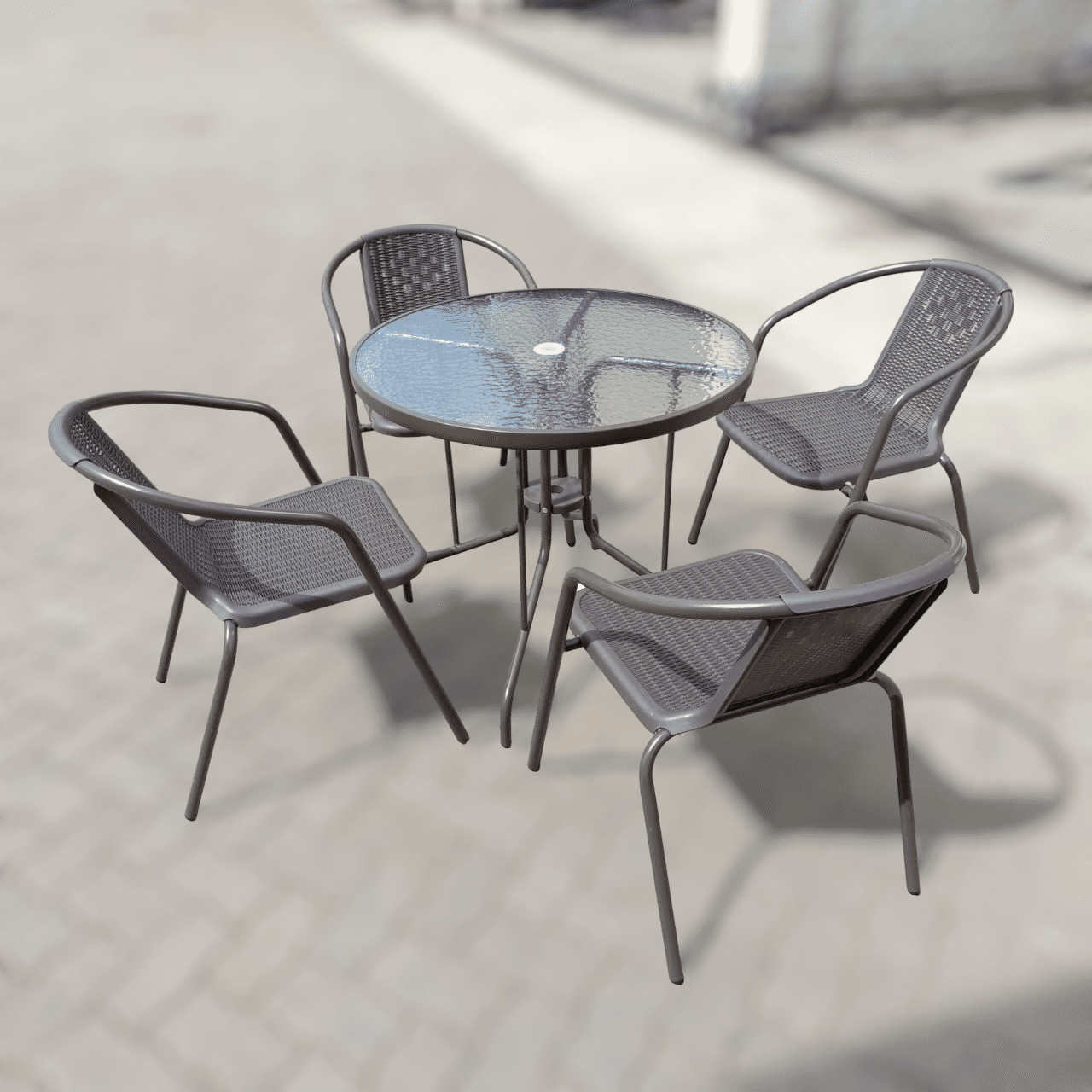 This unique and affordable set features a durable powder-coated aluminum frame, a tempered glass tabletop, and stackable chairs for easy storage.