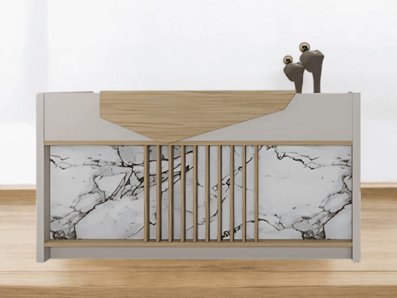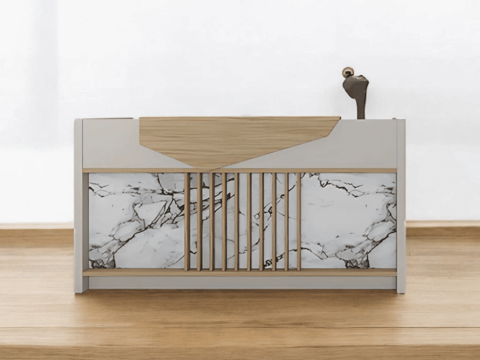 This modern design features a sleek blend of white, dark grey, and beach laminate, built with durable MDF.