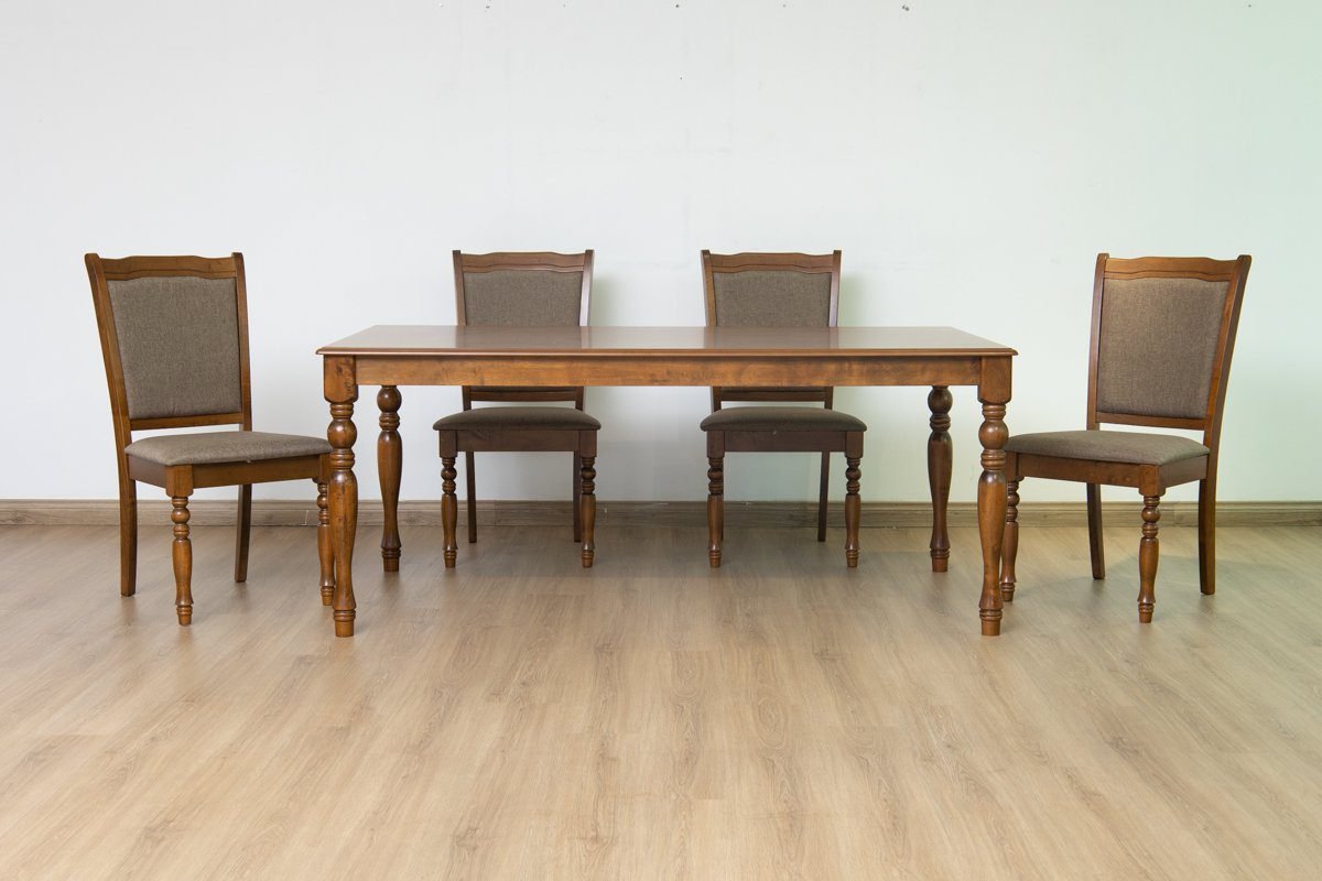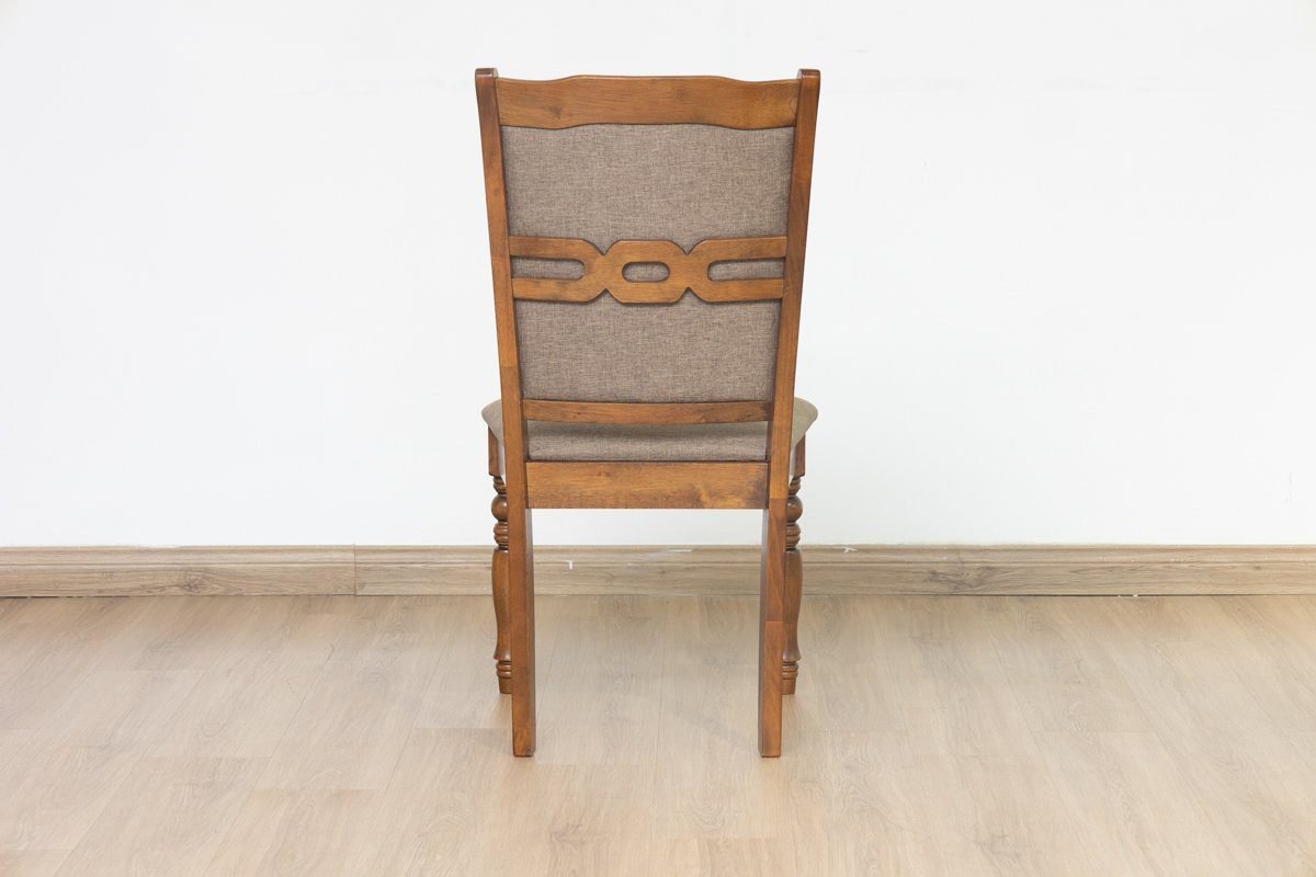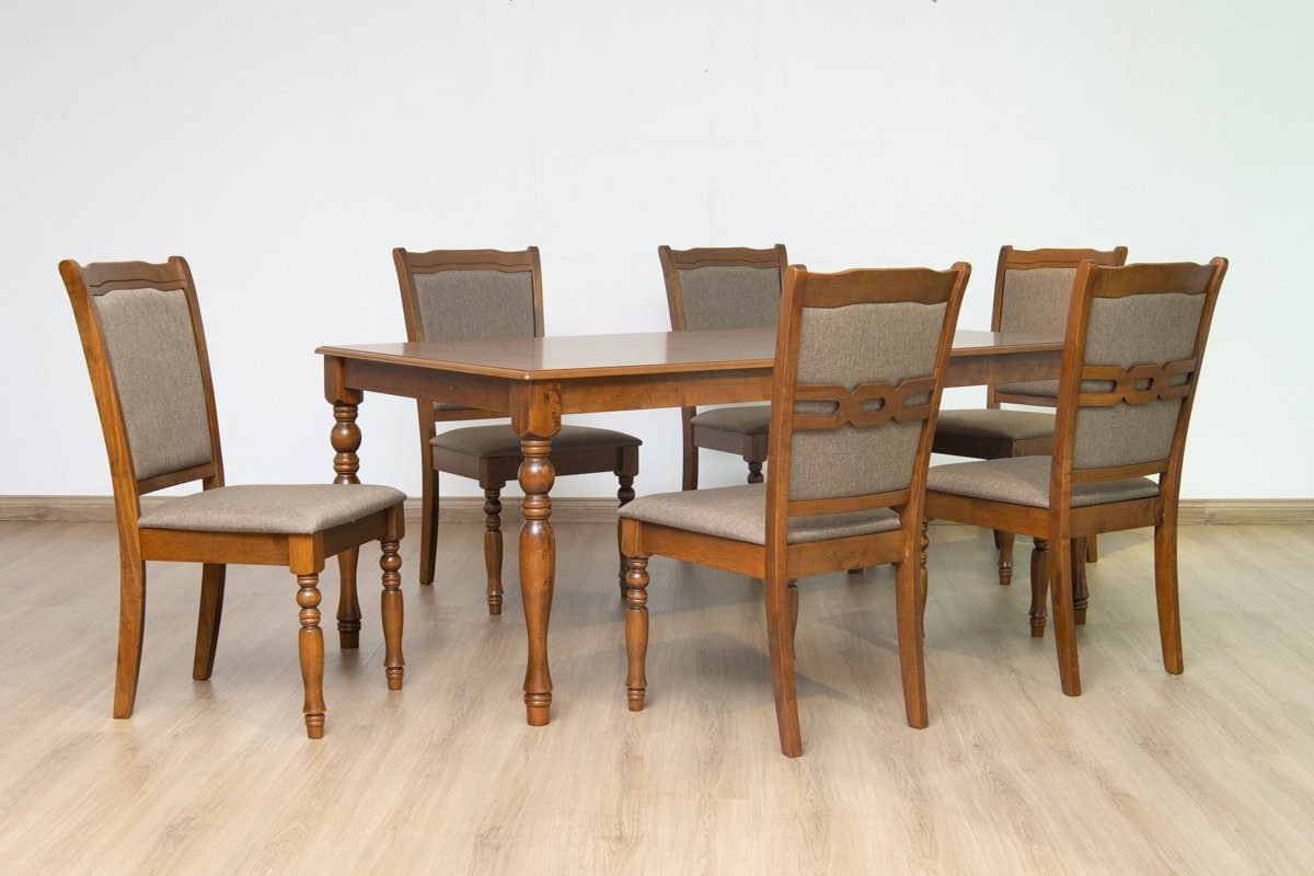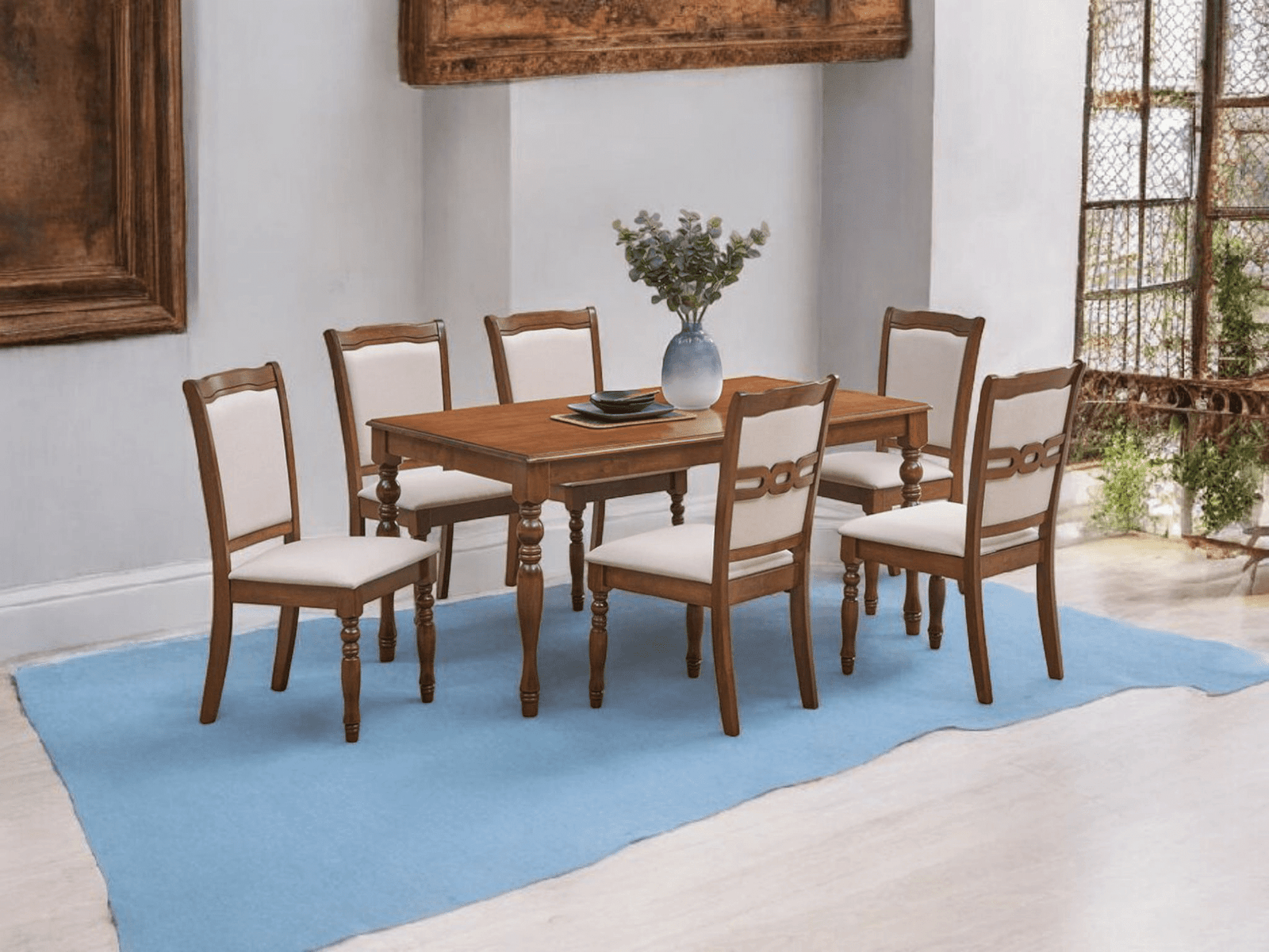 This 7 piece dining set features a warm, brown finish dining table with a sturdy wooden top dining table and wooden legs, complemented by fabric dining chairs with a distinctive design.