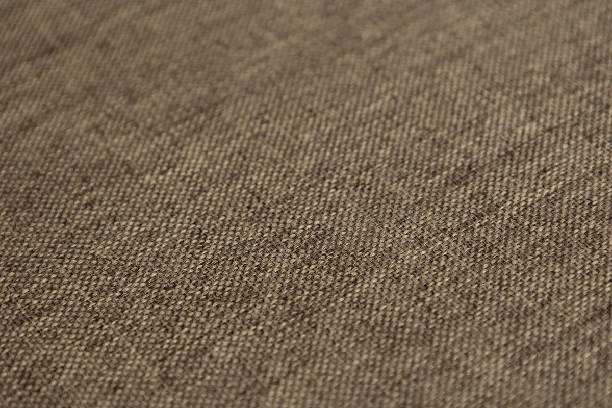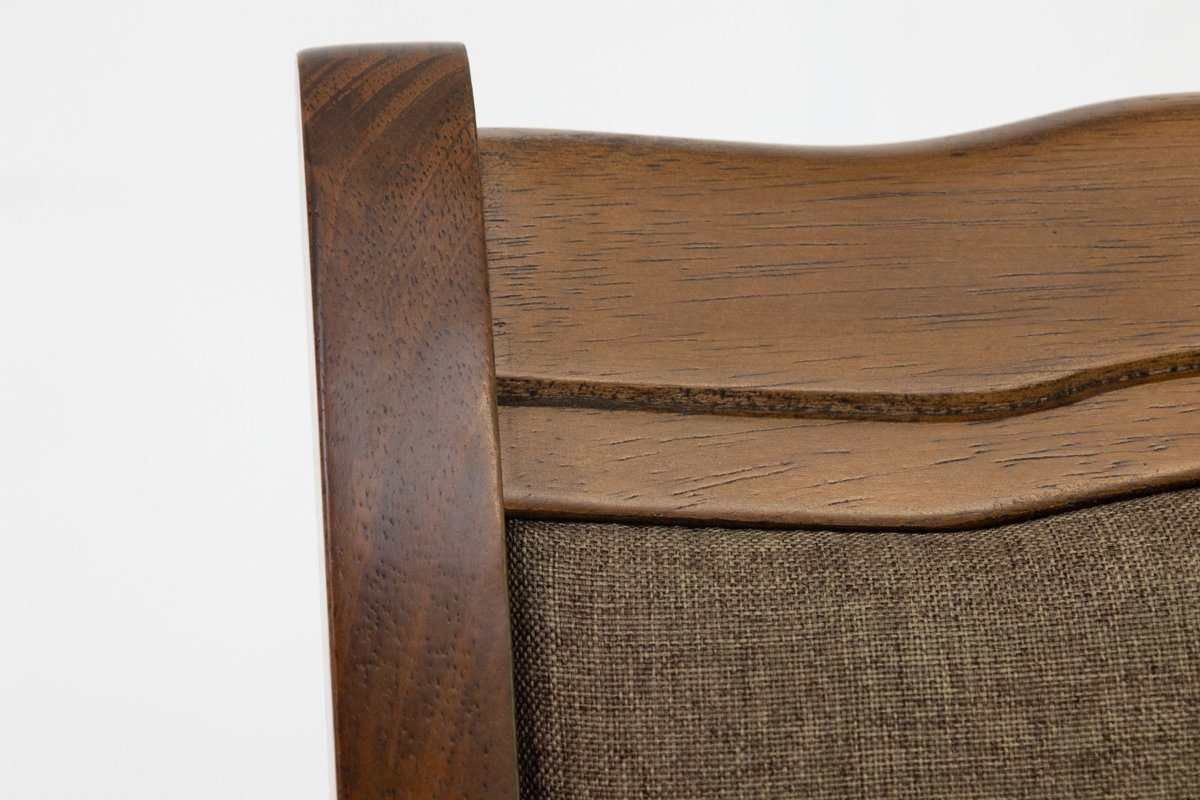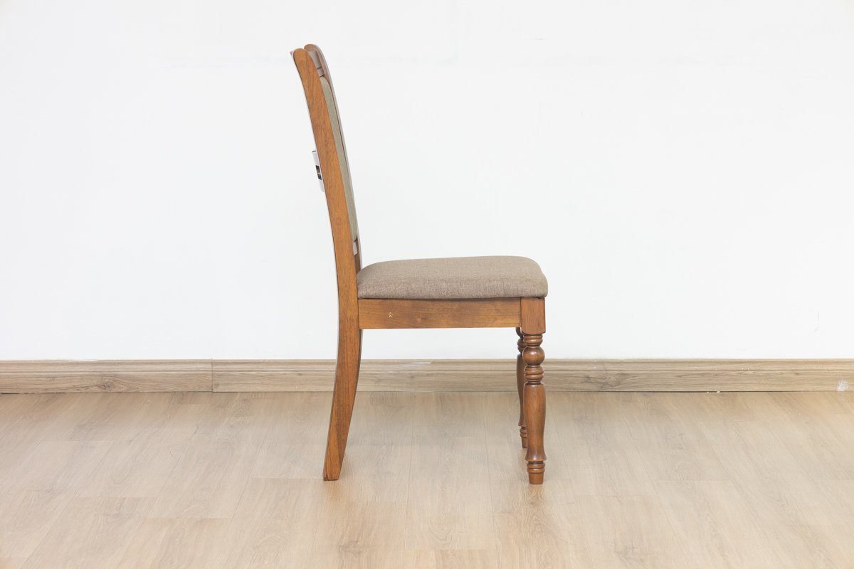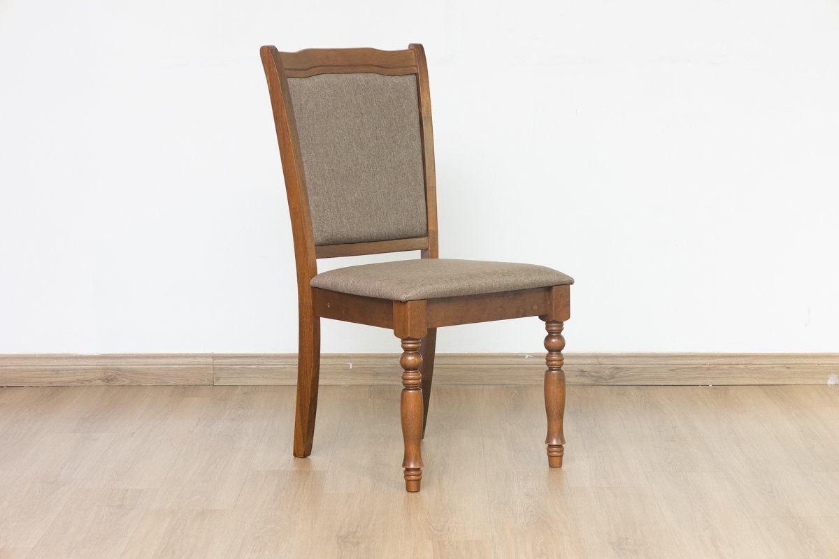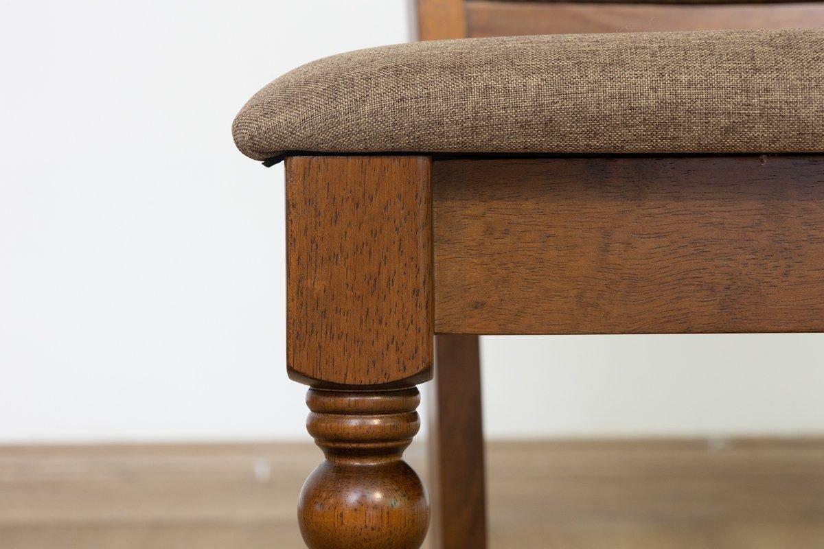 This 7 piece dining set features a warm, brown finish dining table with a sturdy wooden top dining table and wooden legs, complemented by fabric dining chairs with a distinctive design.