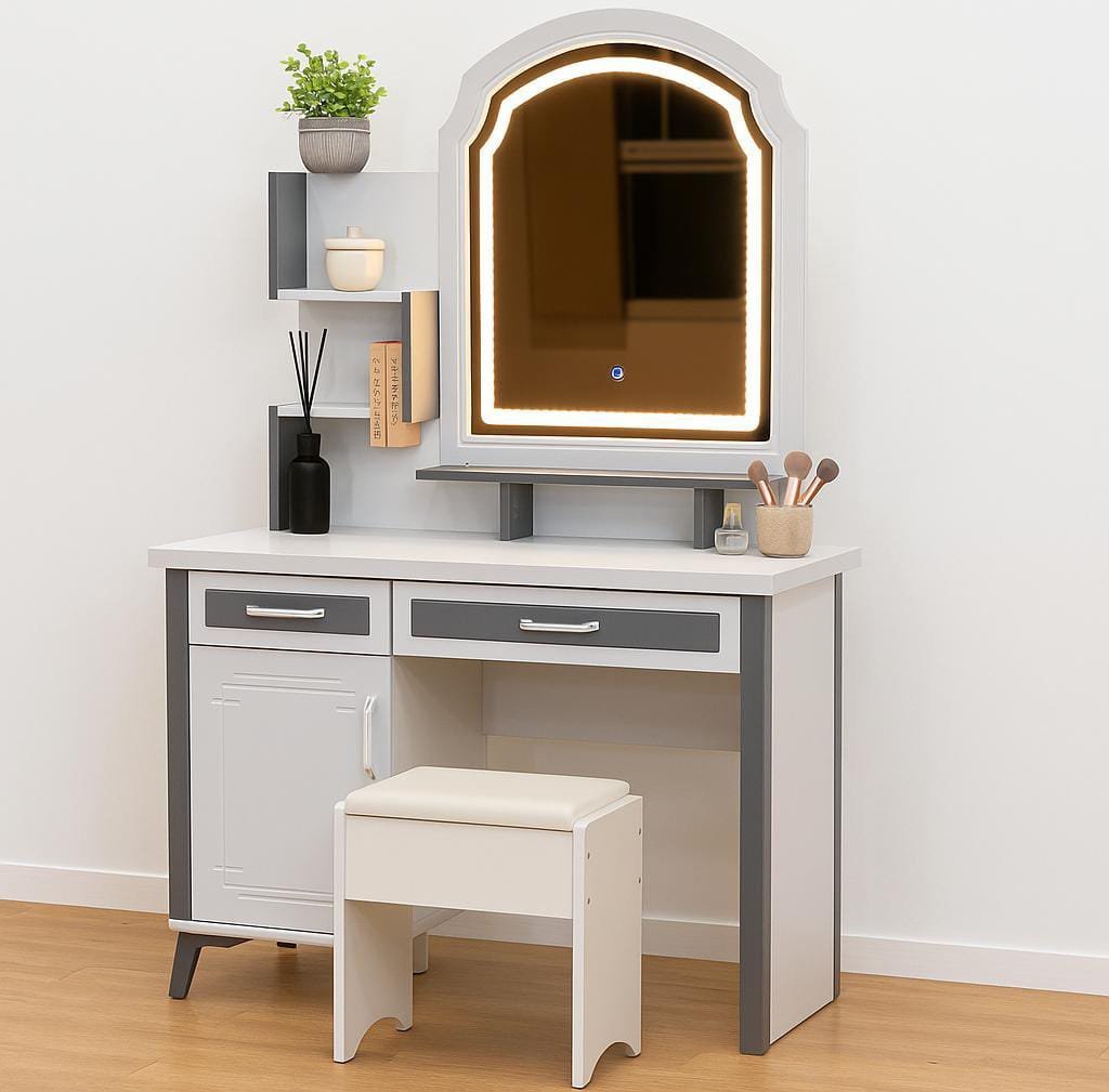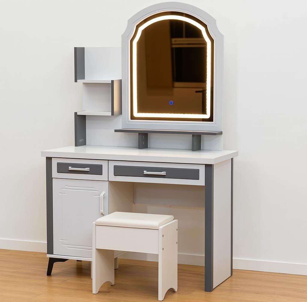 The LED mirror serves as a focal point, making this dressing mirror table not just functional but also visually striking in any modern bedroom or studio setup.