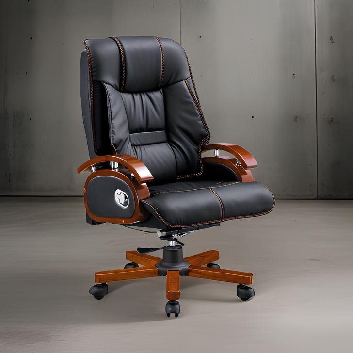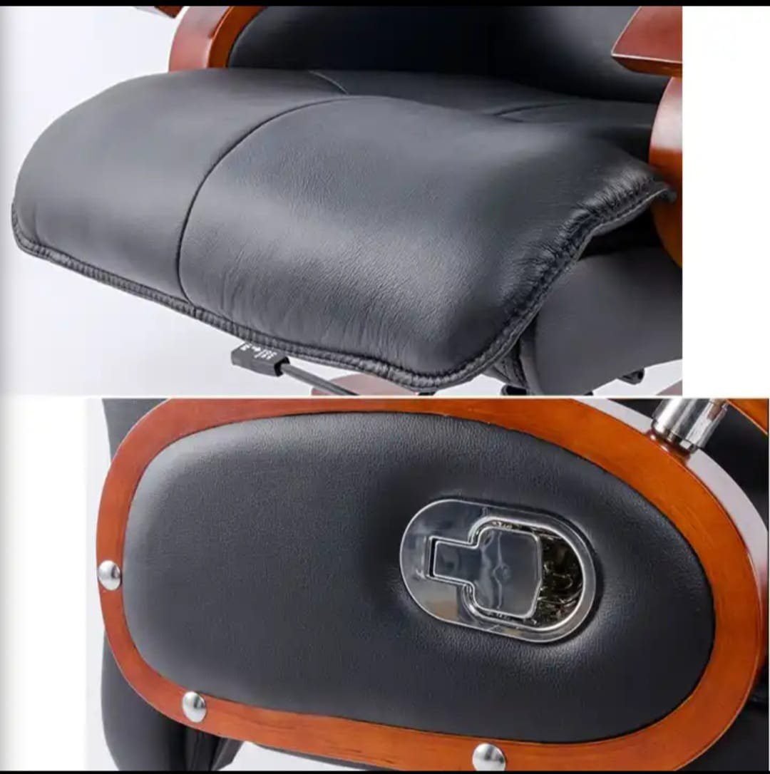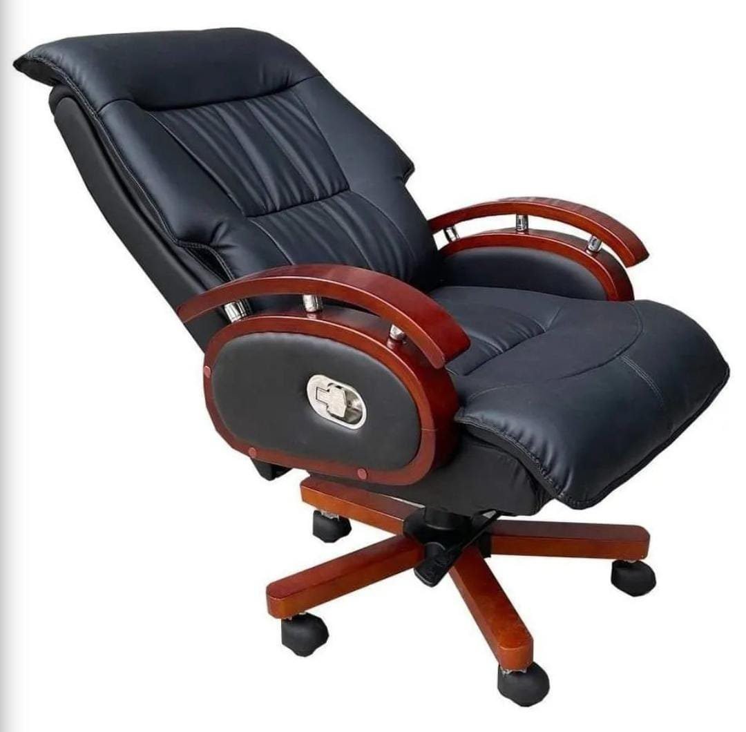 This large luxurious office chair has a solid wood frame. It has a black leather-faced upholstery which adds to the supreme quality of this chair. Features of this chair include a gas height adjustment mechanism, a locking tilt feature with weight tension control and a full recliner mechanism. The chair sits atop a steel-reinforced wooden swivel base with hooded castors under each spoke.